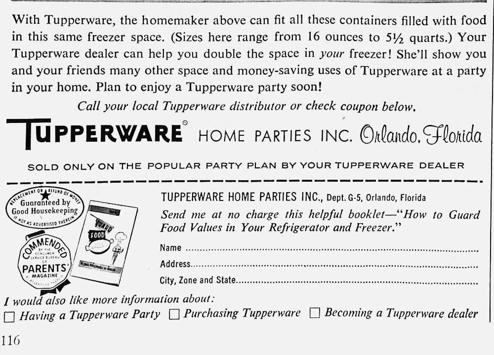 By the time this ad appeared in the September 1964 edition of Ladies Home Journal, Tupperware was a household name. Most everyone knew of Tupperware and their lidded containers. If the person seeing the ad wanted to buy a set of Tupperware, she would have to attend a Tupperware party.