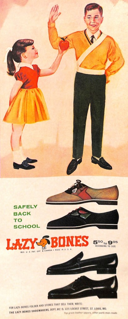 This ad will take you back in time to remember the all important job of a school crossing guard. He was reliable, trustworthy, and best of all, he was well dressed. The one pictured here is wearing an official crossing guard belt, a tie, and a smile. But it is his shoes that are the subject of this September 1964 ad for Lazy Bones shoes.