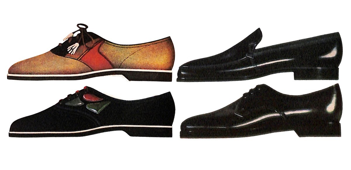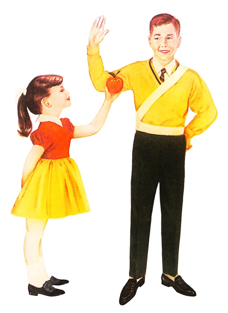 There were four different shoes referenced in the ad. All are crossing-guard worthy and all are classic mid-century and beyond. No word if he ate the apple from the creepy little girl who appears to be wearing mascara and lipstick.
