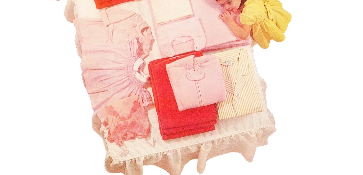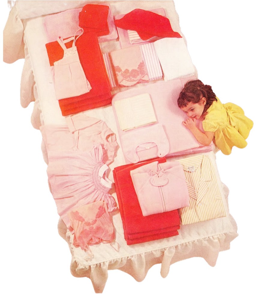 What is this mid-century photo advertising? We see a young girl in a yellow dress leaning over a bed filled with neatly folded clothing, towels, and blankets. What kind of product is it advertising?