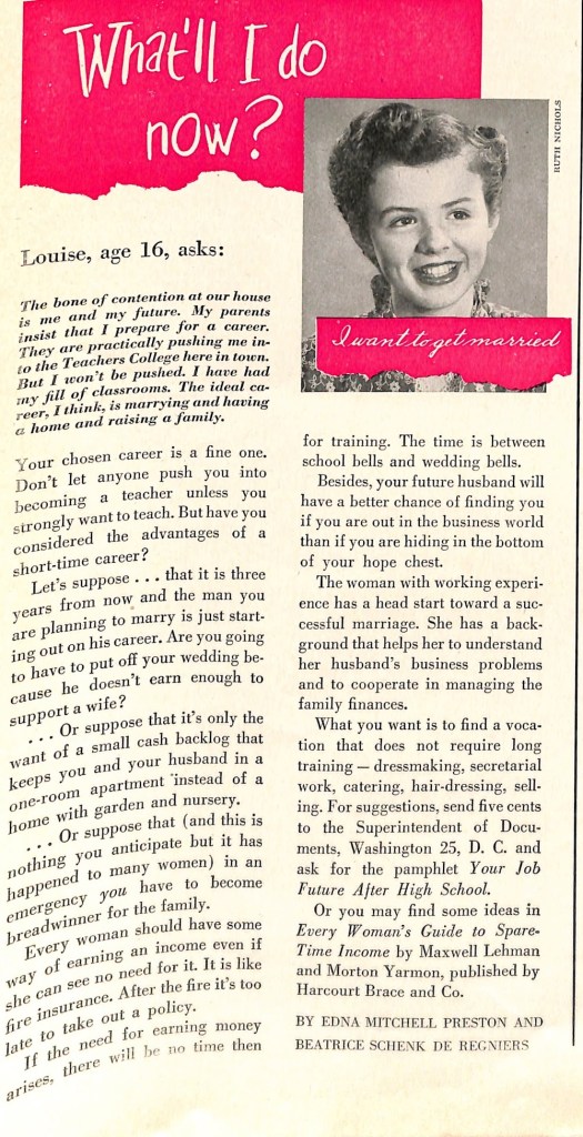 You likely know that the practice of writing to a newspaper or magazine for advice was popular in the mid-century. The March 1951 edition of McCalls magazine had a write-in column where a 16 year-old girl wrote to seek advice about problems she was having with her parents. Her parents wanted her to learn a vocation. She wanted nothing more than to get married.