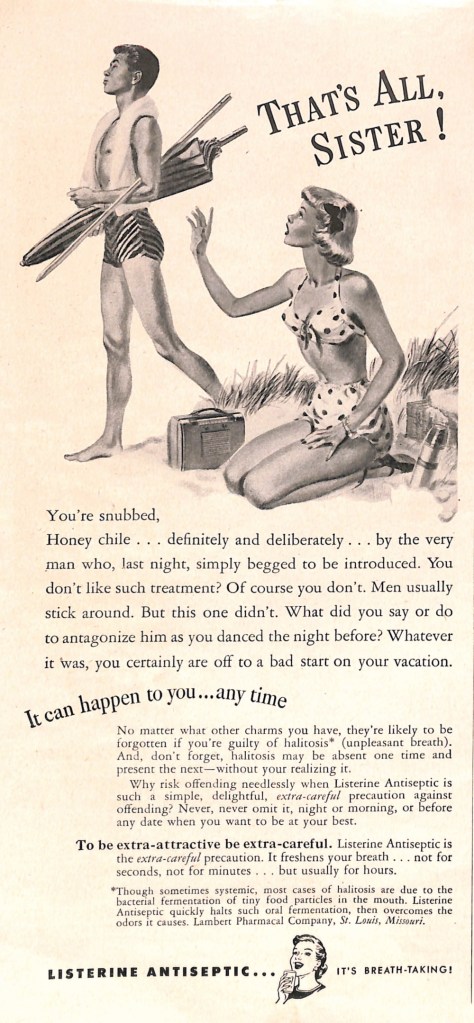 And then there’s those who don’t use Listerine. These poor folks are destined to be outcasts. Here are a few ads from the early mid-century that use fear to convince people to buy Listerine.