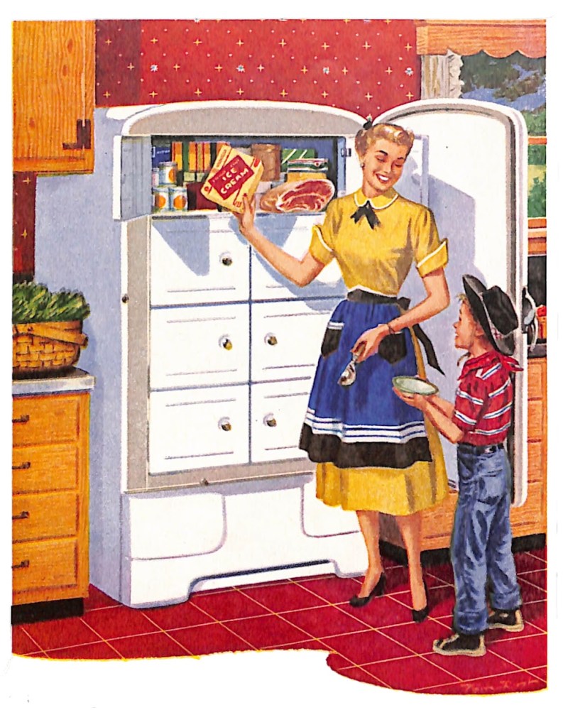 This little buckaroo and his empty bowl comes to us all the way from 1952. The illustration of an eager boy and his accommodating mom is for an ad for a stand-alone Manitowoc Sub-zero freezer. The ad provides information to mid-century homemakers about how to potentially fit the freezer into the kitchen to serve as a partner to a refrigerator.