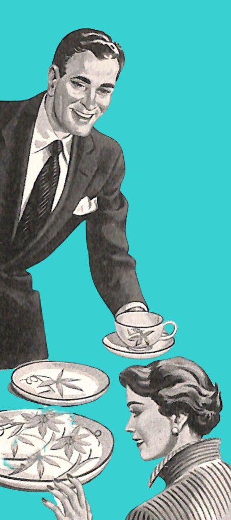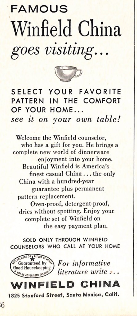 I do admit that I have never heard of Winfield china, or a sales rep that comes to your home to sell you table ware. The image you see came the January 1959 edition of Good Housekeeping magazine. The 1/4 page ad was for the Winfield sales process where a “Winfield counselor” comes to your house to show you china. The direct marketing approach worked for Avon. Why not try it with china?