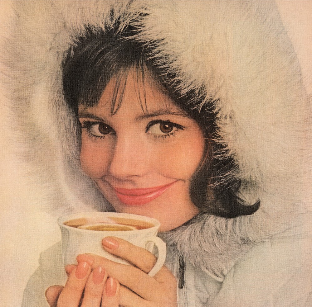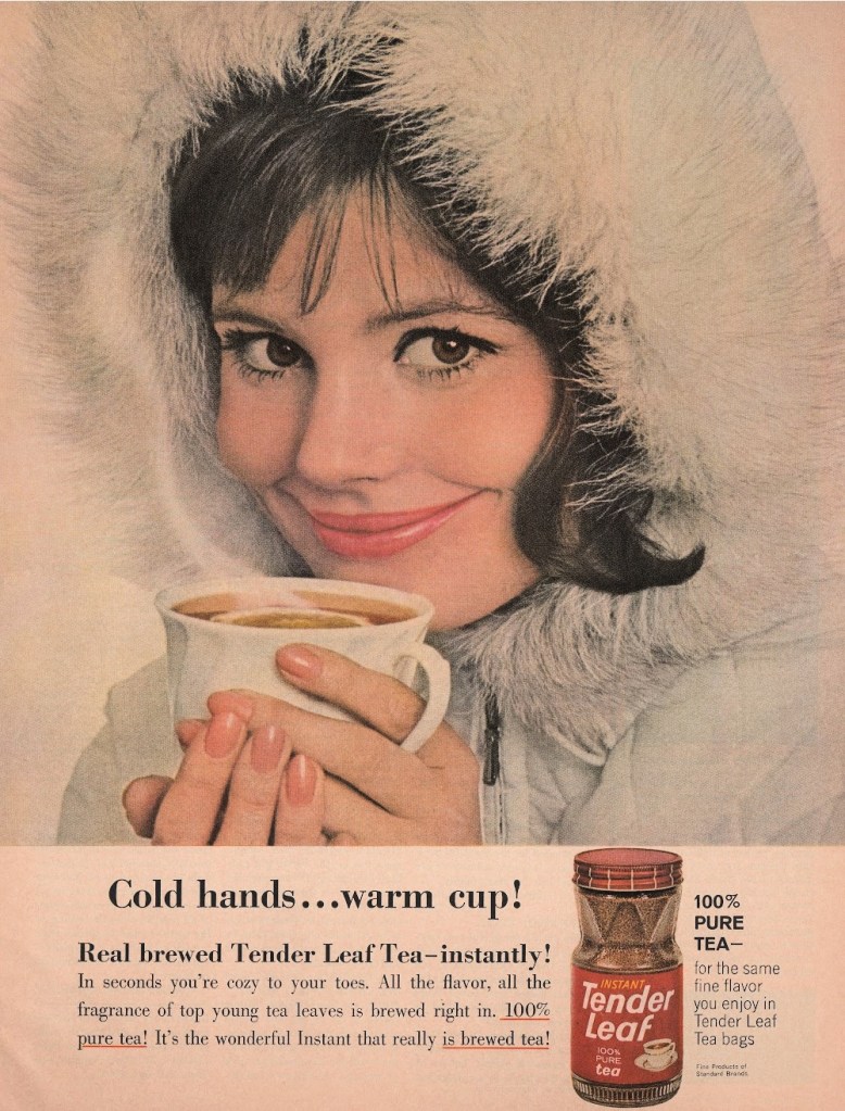 Food Grocery 1963 – Cold Hands: Warm Cup Tender Leaf instant and a fur parka by JanetSeptember 16, 2022 Comments 0 What’s this sixties ski girl drinking? Tender Leaf instant tea. In seconds you’re cozy to your toes. Tender Leaf Instant Tea Ad – Ski Parka – McCalls December 1963 More Tender Leaf Tea Ads 1959 – Bill Cullen for Tender Leaf Tea 1952 – Tender Leaf Smiling Cups More Mid-century Ski postings 1963 Stretch Pants and Parkas Share this: Click to share on X (Opens in new window) X Click to share on Facebook (Opens in new window) Facebook Like Loading... 0 comments on “1963 – Cold Hands: Warm Cup” Leave a comment Cancel reply Δ Post navigation Previous Post Next Post