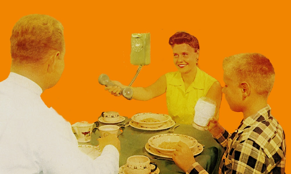 Many of us living in the 2020’s have a rule. No phones at the table. Family meals are meant to be a time where the phone should be put away while you enjoy a face-to-face conversation with your family. But this was not the case for this mid-century family sitting down together for an oatmeal breakfast. The phone hangs on a wall with a long cord. It stretches all the way to dad.
