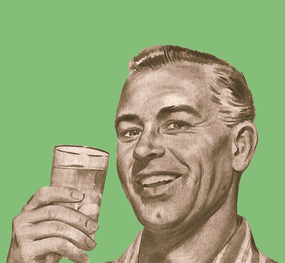 This mid-century man holding a glass while still in his PJ’s is trying to solve a problem. Shh. It’s a bit personal. He’s constipated. This graphic appeared in the February 1948 edition of Good Housekeeping magazine for Sunkist lemons. Their advice?