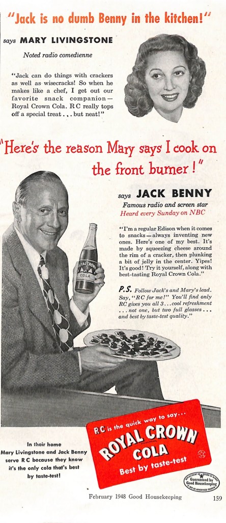Benny’s wife Mary Livingstone is also featured in the ad which was published in the February 1948 edition of Good Housekeeping. Mary was also a comedian who starred alongside her husband. The ad did triple duty. Advertise RC Cola, advertise Jack Benny’s radio show, and share a quick snack recipe with the readers.