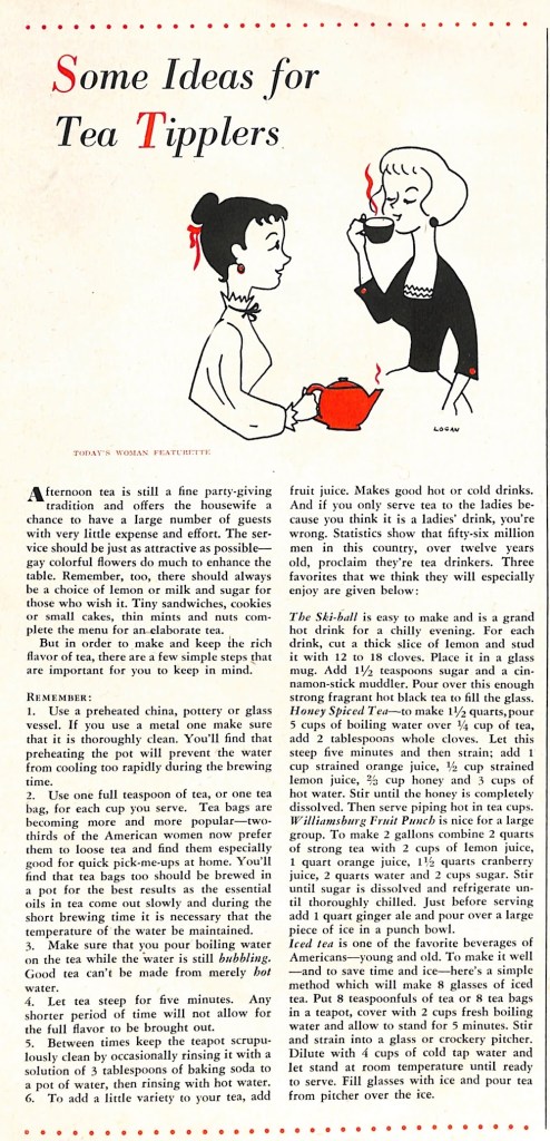 We continue our look at mid-century beverages with this article from the February 1952 edition of Today’s Woman magazine. The subject? Tea. The article called “Some Ideas for Tea Tipplers” offers advice for the ladies-who-lunch crowd. In case you want to do a bit of social climbing with a tea party, here are some recipes.