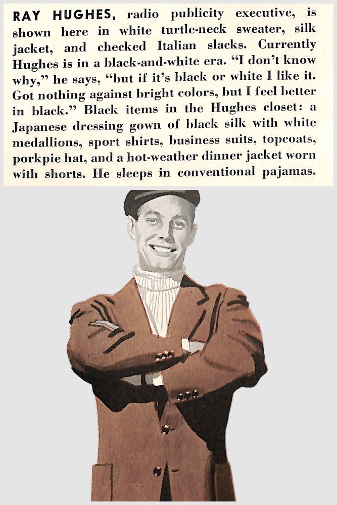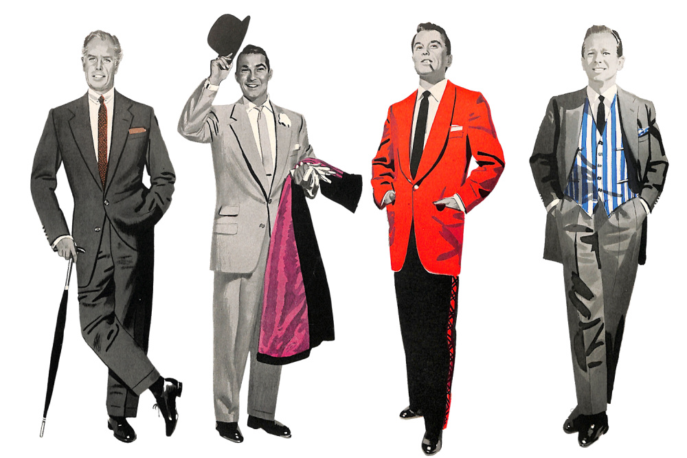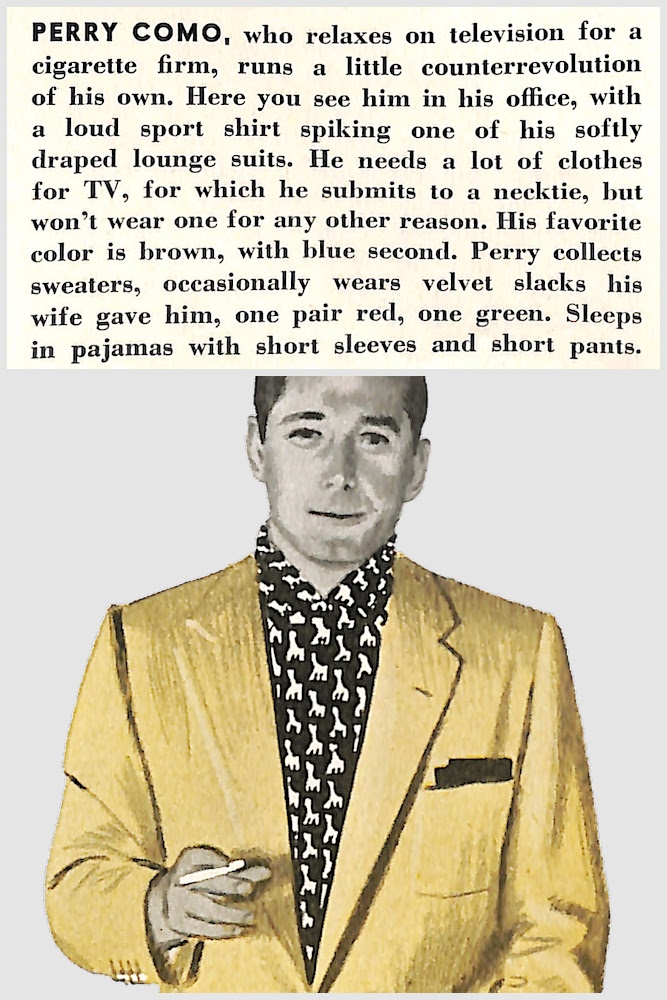 In 1983, ZZ Top sang about the Sharp Dressed Man. In 1955, Jon Whitcomb illustrated him. The popular artist had a monthly column where he displayed his artistic talents to readers of Cosmopolitan. For the May 1955 issue, he choose the topic of men’s fashion and told about 7 personalities who excelled at dressing sharp. The men you see above are radio executive Ray Hughes, entertainer Perry Como, and Illustrator Alex Ross.