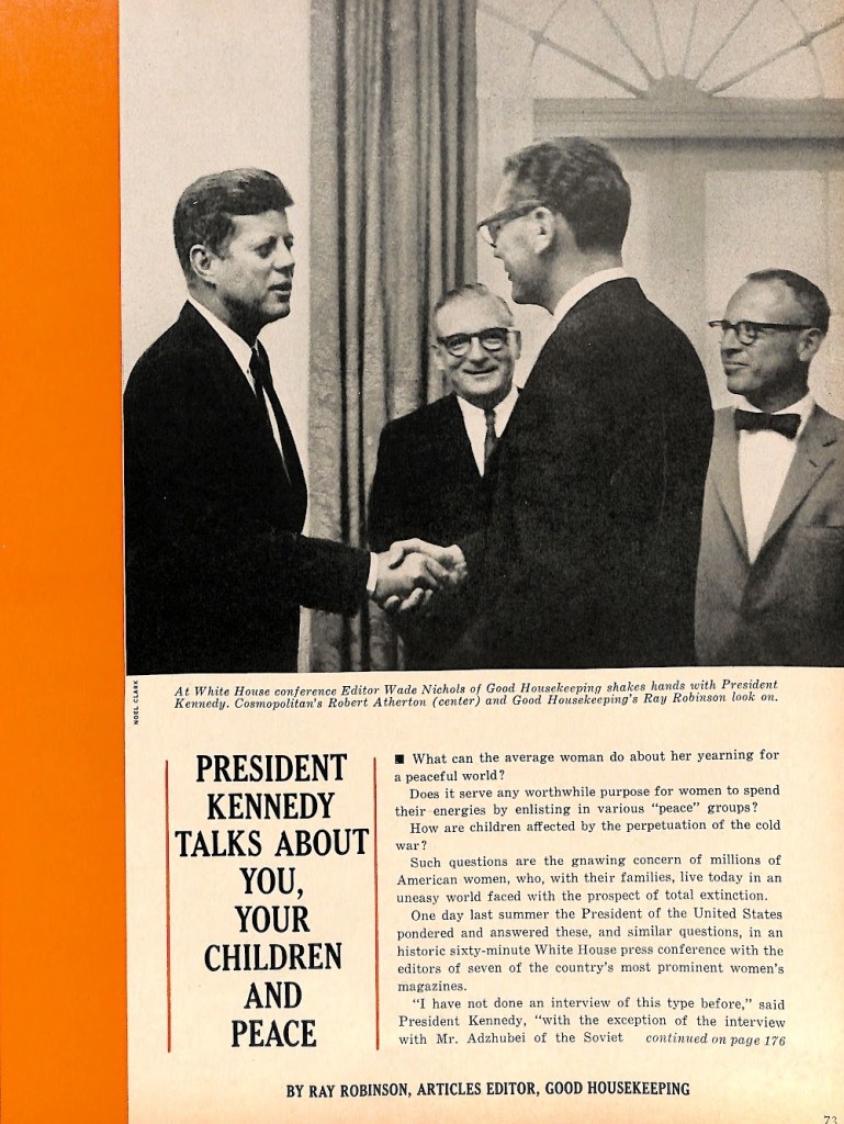 The article you see below was published 59 years ago in the November 1963 edition of Good Housekeeping magazine. It was written by Ray Robinson and titled, “President Kennedy Talks about you, your Children and Peace”. It was a result of a June White House press conference where president Kennedy invited women’s magazine editors to come to the White House to discuss the subject of women and world peace. Robinson and Wade Nichols from Good Housekeeping and editors and writers from McCall’s, Redbook, Women’s Day, Family Circle, Parents, and Cosmopolitan were among the attendees. All but 2 were men.
