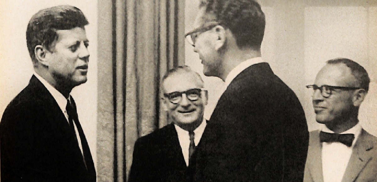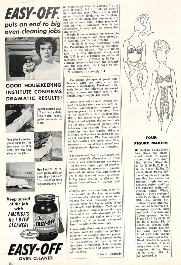 Ironically, the editors choose to place JFK’s press release on a page in-between an Easy-Off cleaning ad, and bra & girdle article.
