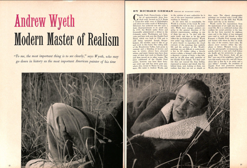 The theme of the February 1959 issue of Cosmopolitan was art. Among the pages was this rare article titled, “Andrew Wyeth–Modern Master of Realism” written by Richard Gehman. The article told about how the talented mid-century artist lived with his wife and two sons in Chadds Ford, PA and how the beautiful setting and townspeople were inspiration for his work.