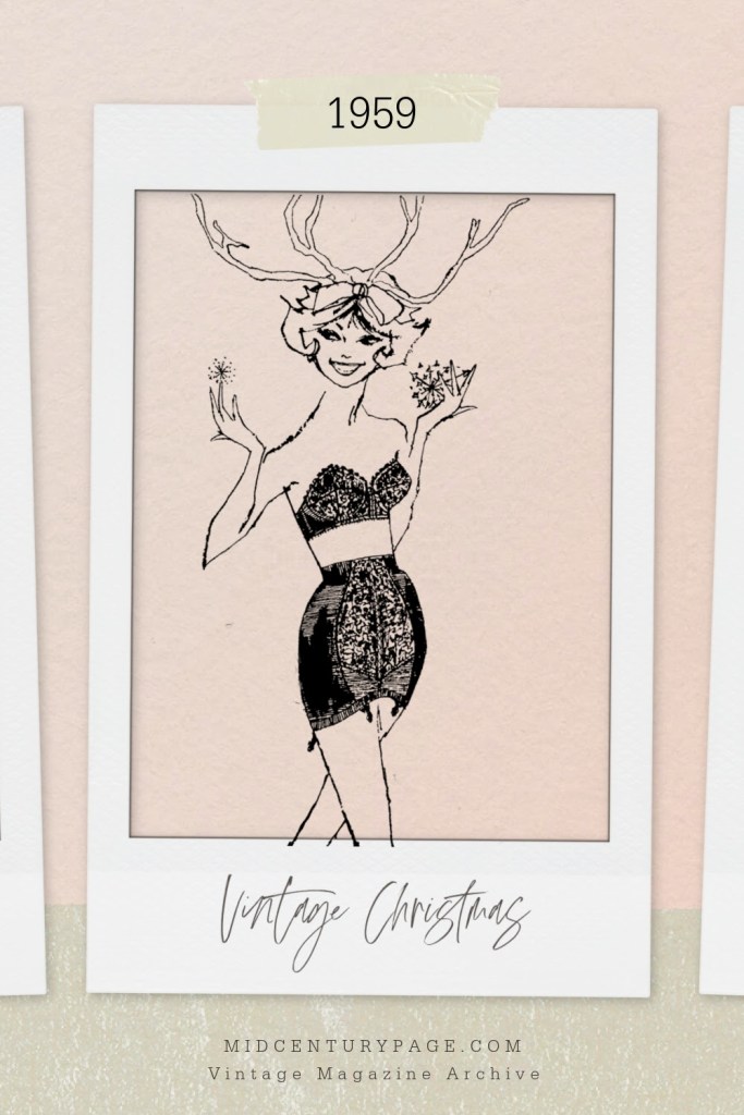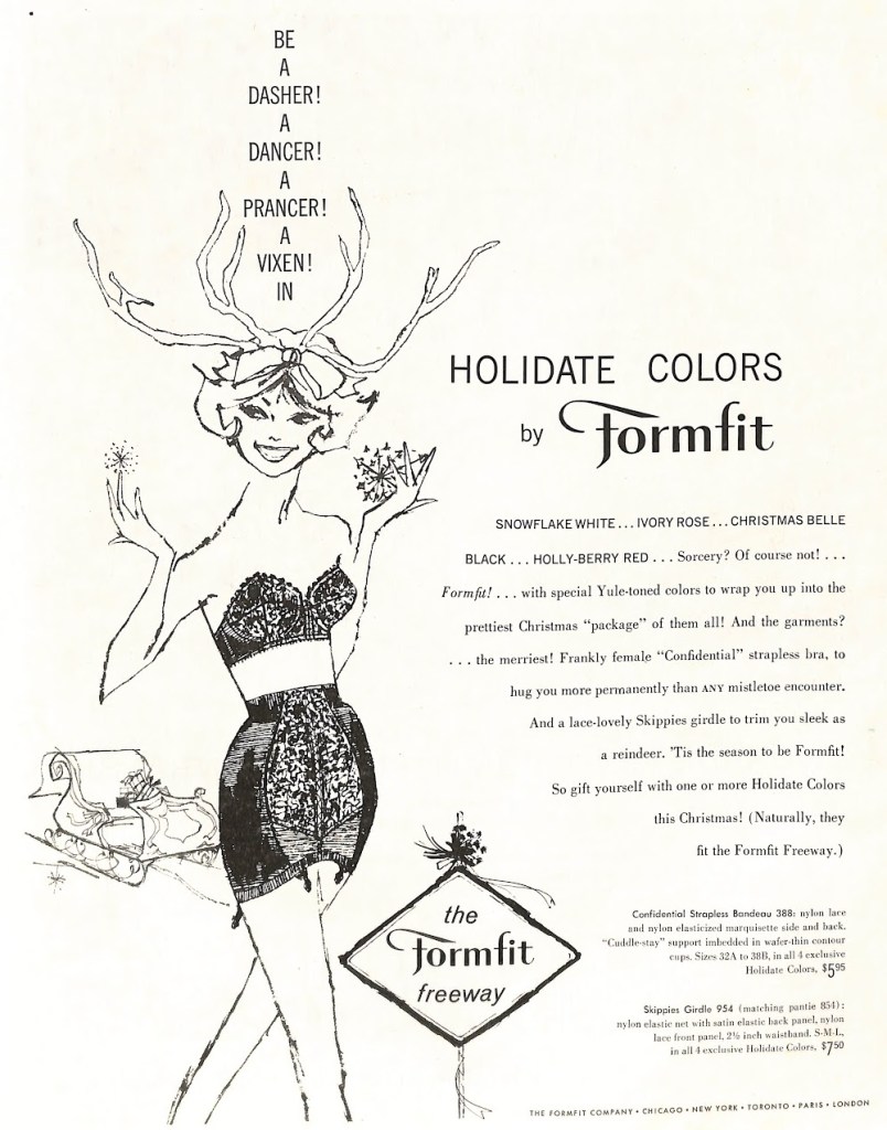 This fun ad appeared in the December 1959 issue of Ladies Home Journal. Holiday colors included snowflake white, ivory rose, Christmas belle, black, and holly-berry red. The strapless bra sold for $5.95. The girdle sold for $7.50.