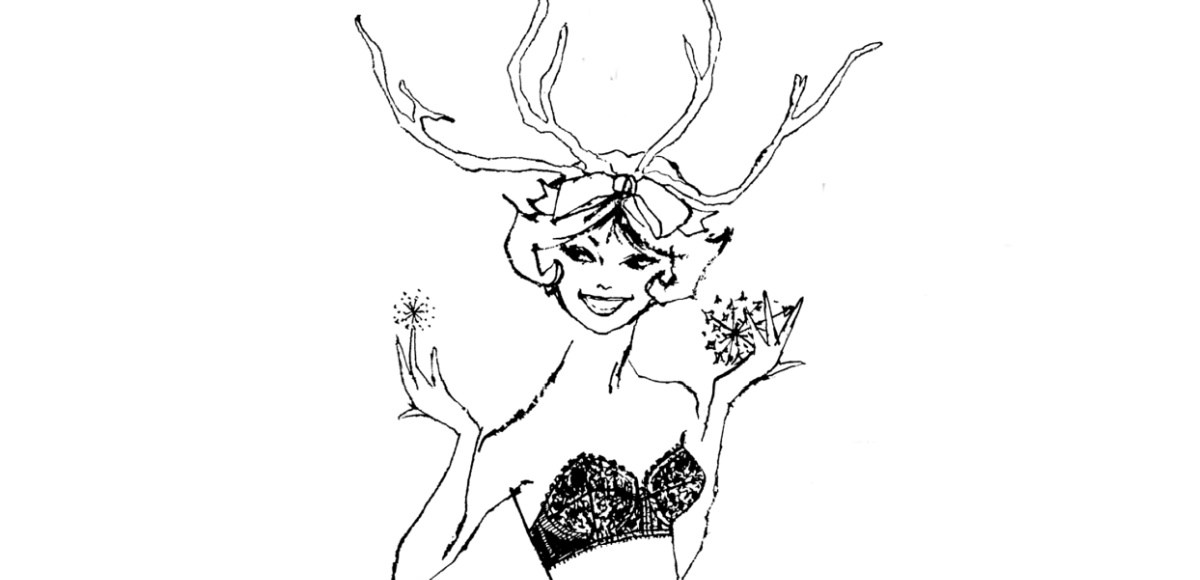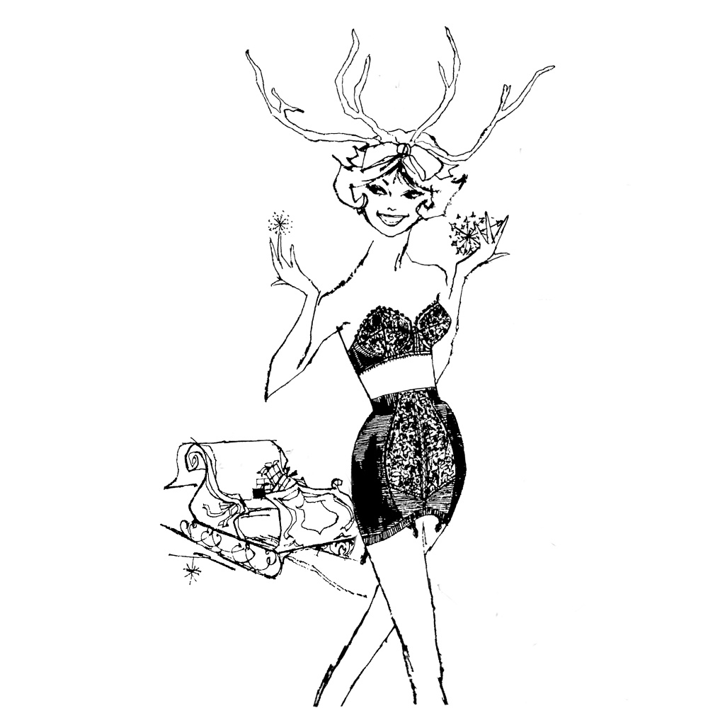 It’s December 1959. Your ad agency is tasked with promoting the new line of holiday-themed bras and girdles from Formfit. How to you play it? Add reindeer antlers to your sketch showing the Formfit girl wearing a strapless bra and lacy girdle and name her Vixen!.