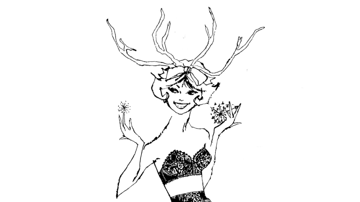 In December 1959, Formfit promoted holiday bras and girdles using a playful ad featuring “Vixen” in festive colors and reindeer antlers.