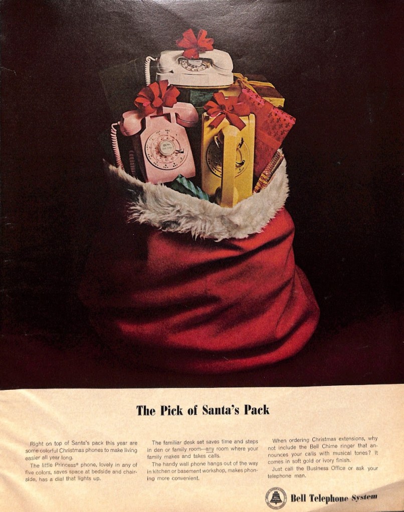 If you are gonna ask Santa for a phone this Christmas, you better be specific. You wouldn’t want him to grab from this bag of phones from 1963. These bad boys were all the rage in the mid-century when Bell Telephone did double duty. They provided both phone service and the phones themselves. Officially, these dial phones were called rotary phones. There was the princess phone, the desk phone, and the wall phone. They came in a variety of colors. If you had a pink princess phone in your bedroom, you were lucky indeed. If you had one with a special ring tone, you were just plain spoiled.