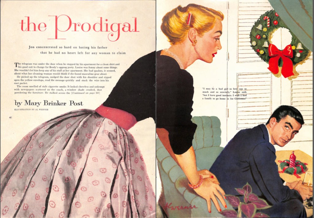 We continue our look at Christmas-themed illustrations that appeared in mid-century women’s magazines. Like yesterday, this one comes from the December 1952 edition of Today’s Woman magazine. It is illustrated by Al Werner for a story titled the Prodigal by Mary Brinker Post.
