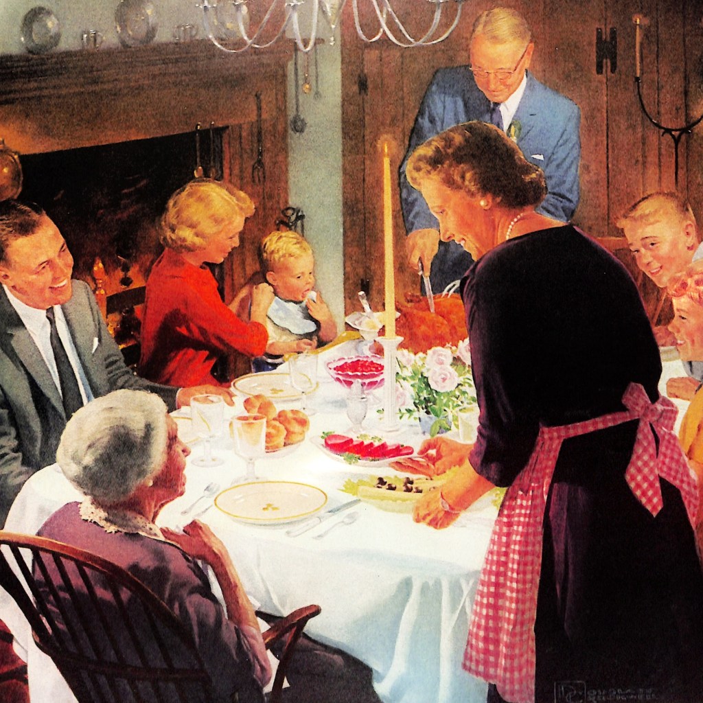 I choose this charming image of a family having Christmas dinner as the muse for today’s post. The four generation family has gathered to feast and celebrate.
