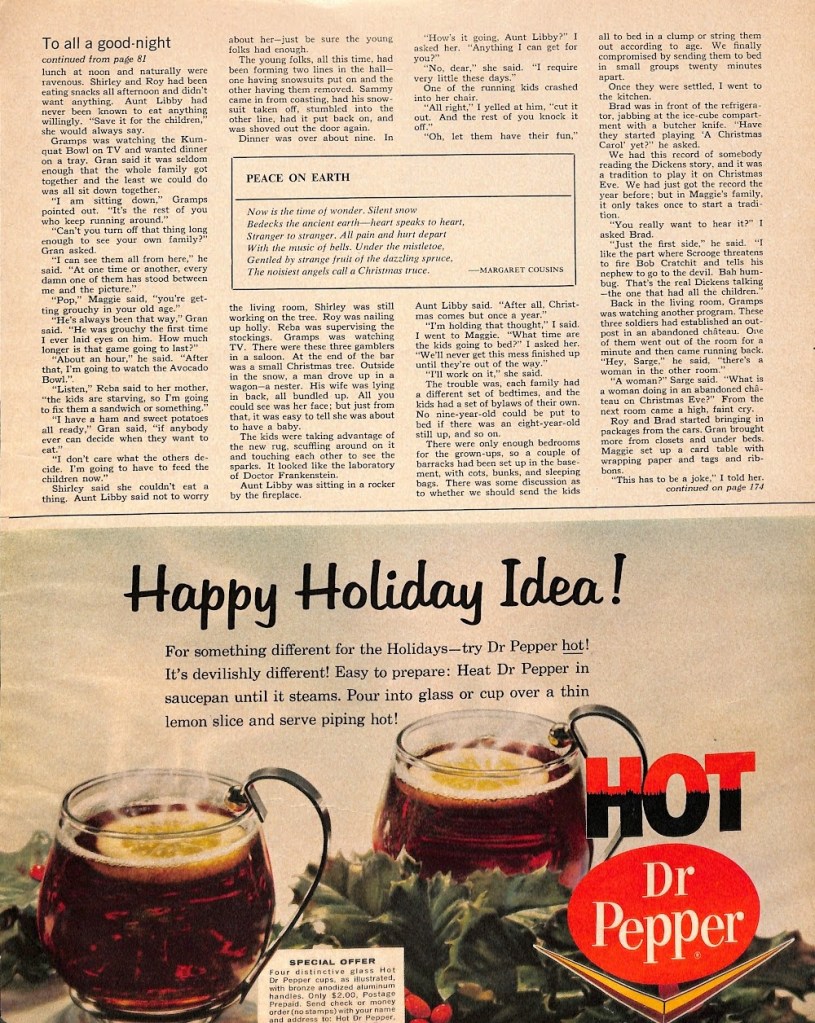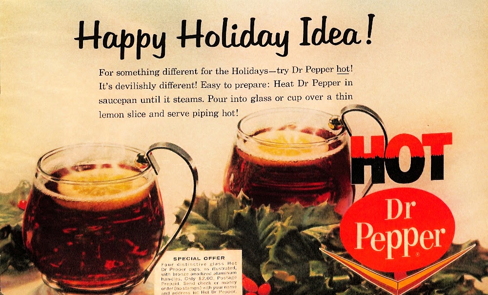 Steamy Dr Pepper? Why not? Hot Dr Pepper was a thing in the 1960’s. They even sold special Hot Dr Pepper glass mugs to serve the steaming soda in.