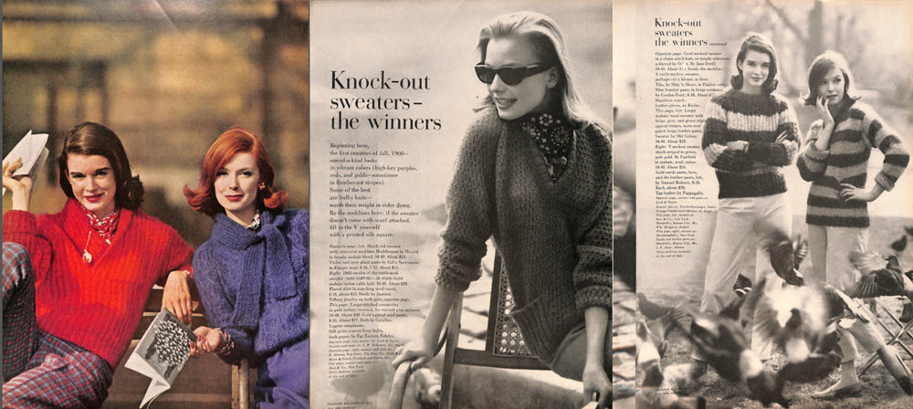 Today we see vibrant colors and mixed prints from the July 1960 edition of Glamour magazine. Their message to readers was to wear bulky sweaters in bright colors and add a silk scarf for extra interest. The women above on the left is wearing a shock red cross over brushy mohair sweater and wool plaid pants by CoCo sportswear. The sweater sold for $23 in 1960. The pants? $13. The violet outfit on the right came from Jantzen. Here’s how they described the sweater.