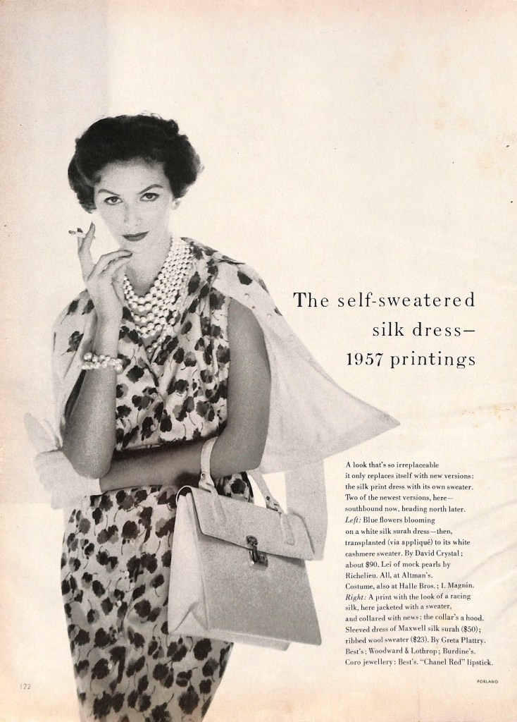 My search for sweaters from mid-century women’s magazines led me to the January 1957 edition of Vogue magazine. There, I found this over-accessorized outfit. It is complete with pearls, gloves, a cigarette, and a matching bag. The dress is silk and the sweater is cashmere. They called it a self-sweatered silk dress because the sweater contains an applique using silk from the dress.