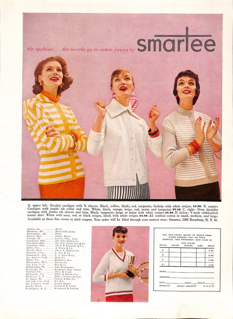 We continue our hunt for mid-century sweaters with this ad for Smartee cotton sweaters. The ad appeared in the March 1956 edition of Glamour magazine. Note the similar styling that we have seen with other looks from the mid fifties. The cardigans are worn buttoned up with silk scarves, bracelets, red nail polish, and pencil skirts.