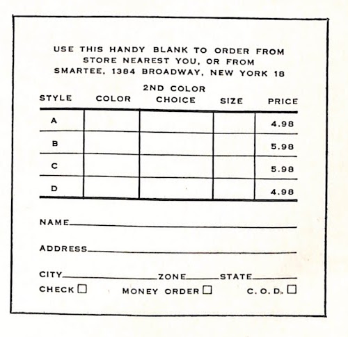 The sweaters sold for under six dollars and were available at fine stores throughout the US. The potential buyer was even given an order form. Note the payment choices: Check, Money Order, or C.O.D. (paying by credit card was not an option).