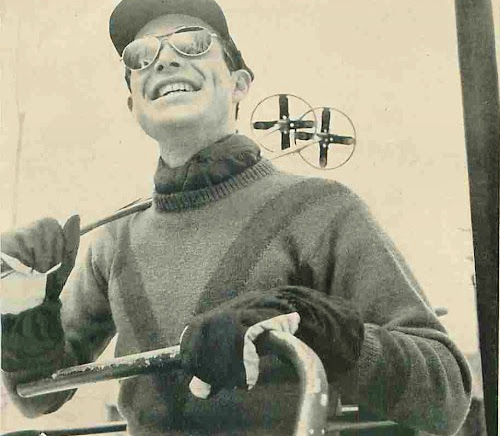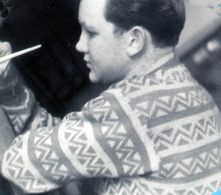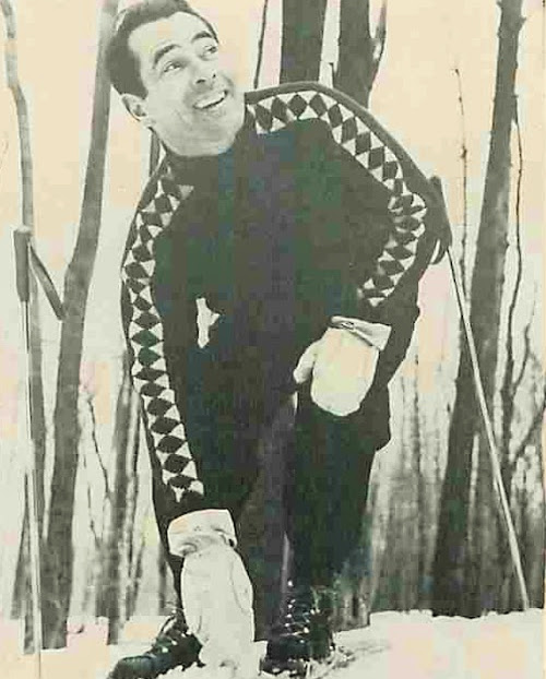 This posting for handmade ski sweaters from the November 1952 edition of Today’s Woman magazine comes with a sweet memory. When I saw the harlequin plaid sweater in the picture above, my thoughts lead me to the late seventies when I was a college student home for Christmas break. For some reason, I was looking in my dad’s closet when I noticed an old wool ski sweater. It was beautifully vintage and I knew I had to have it. Without asking, I grabbed the sweater and put it in my suitcase. I wore that sweater all winter and enjoyed the warmth of the sweater and the compliments that I got when I wore it. Fast forward to the nineties when I was scanning old family photographs for a birthday celebration and found this photo of my dad wearing the sweater. The year would have been about 1952.