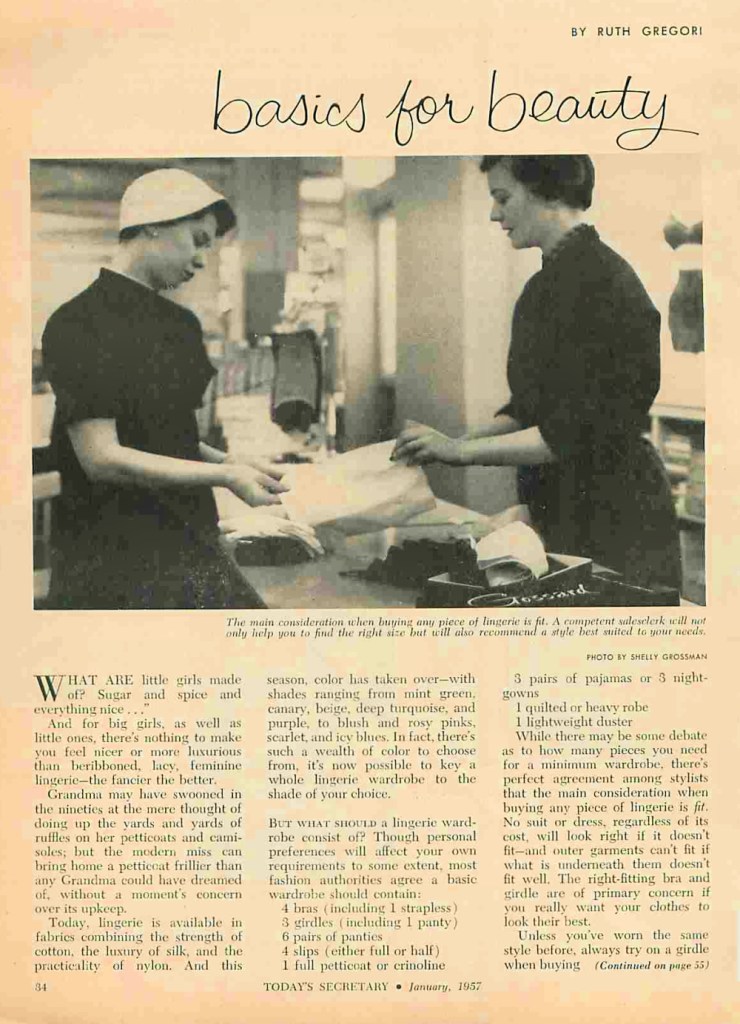 What did the mid-century working woman need to fulfil her lingerie wardrobe? According to this article that appeared in the January 1957 issue of Today’s Secretary magazine, a complete lingerie wardrobe consisted of the following: