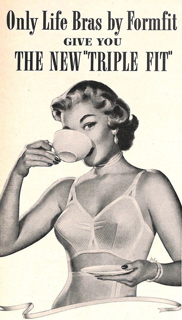 This image of a mid-century woman drinking a cup of coffee while wearing only a bra comes to us from the September 1951 edition of McCalls magazine. The pin-up style drawing is an example of a classic 1950’s ad for a necessity of readers of McCalls – the bra. FormFit would have been an ad campaign in the 1950’s that the fictional Don Draper would most desire. Imagine the ad team brainstorming the concept of “Triple Fit”.