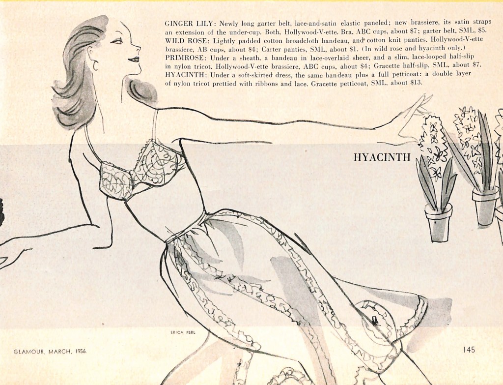 To really be on trend, the article suggested using color and lace to make the undergarments fun. It talked of colors that you might find in your garden. Ginger Lily, Wild Rose, Primrose, and Hyacinth were the suggested colors. Even though the subject of the article was color, the magazine only provided black and white line drawings. Illustrations by Erica Perl reflected a feminine vibe which would have been important to women interested in fashion trends in 1956.