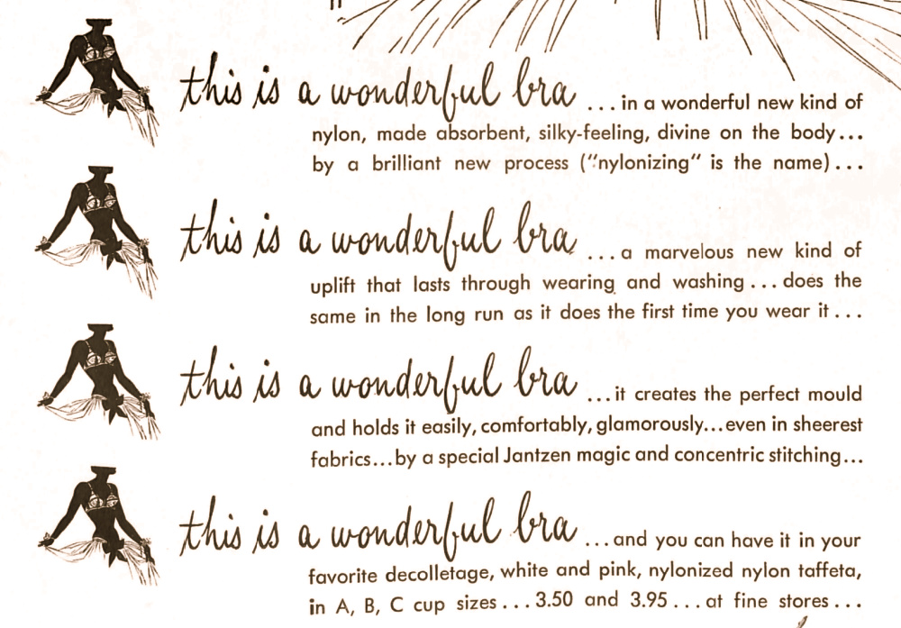 Since Jantzen specialized in both swimwear and foundations, the post-war industry that produced nylon and spandex would have been important to the brand. Creating mid-century foundations was a bit of a science itself. The garment would have to stretch with with the body while keeping its shape. A good bra would have to be wearable, easy to put on and take off, and be somewhat comfortable. It would also have to be washable. The ad copy attempts to convince the reader to buy the bra as it explains the science that went into making it.
