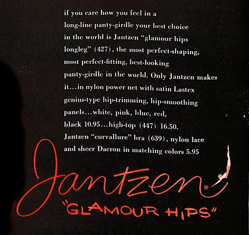 We continue our look at Jantzen foundations with this ad from the November 1959 edition of Cosmo. The black background and red text make it a striking ad to show off their line of colorful panty girdles and Curvallure strapless bras. It is interesting to note that this bra and girdle combination came in white, pink, blue, and black in addition to the red that is shown in the illustration. However, what I find most interesting is the description of the assorted materials used to keep the shape of the girdle.