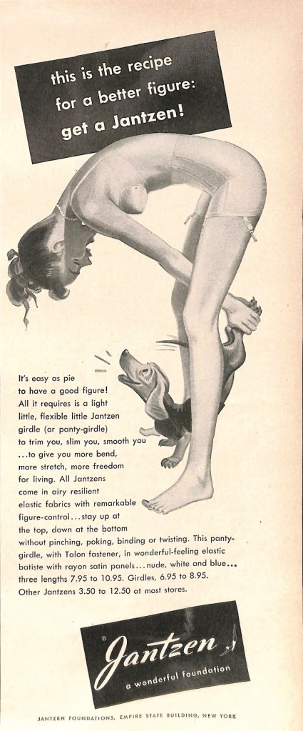 Note that the 1949 ad references elastic vs the 1959 ad which talks of nylon, lastex, and Orlon. These fibers are stronger, lighter weight, and retain their shape more than elastic. Thanks to the development of these fibers, both the garment and undergarment industry has been transformed. Think of today’s culture without yoga pants and spanks.
