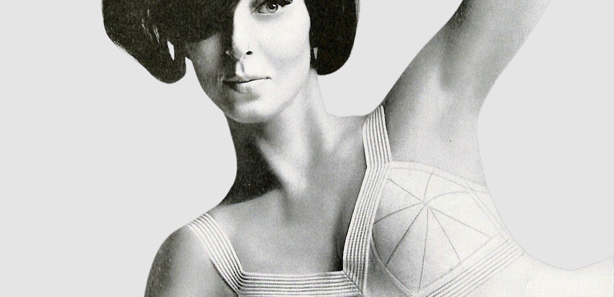 By 1964, the women’s movement began to have an influence on undergarments. Women in the 1950’s wore uncomfortable bras and girdles to form the body into the hourglass silhouette. By 1964, a more natural look was desired. Such was the case with this bra made by Maidenform. It was advertised in the October 1964 edition of Ladies Home Journal. The full page black and white ad shows a confident woman wearing the brand’s cotton Sweet Music bra.