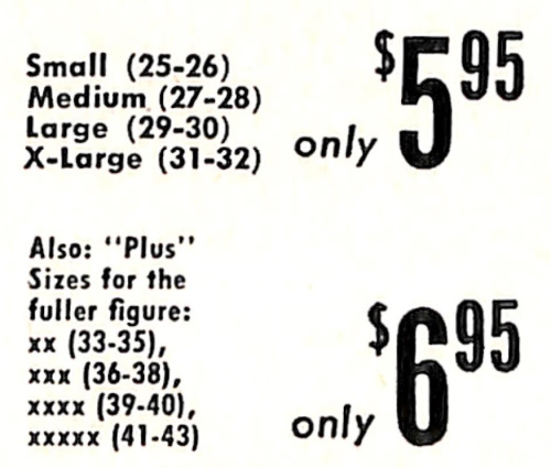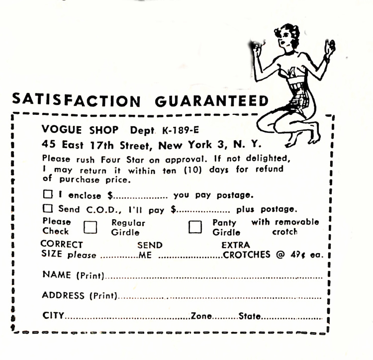 Here is an example of a shapewear innovation from the 1950’s that set out to help with the challenge of putting on a girdle. Enter the zipper girdle. Called the Four-Star girdle, it offered an alternative to the traditional mid-century girdle. The product was offered by mail order only. This was before 800 numbers and certainly before the internet. In 1959, when this ad was published, people had to fill out a form to get something by mail. They also needed to put money in an envelope.