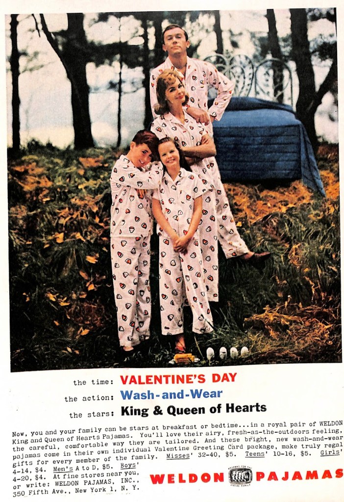 According to the ad copy, the sleepwear sold for $4 for children’s sizes and $5 for adult sizes. The package of Pjs was named “King & Queen of Hearts” wash and wear for Valentine’s Day. It came with a Valentine greeting card. This fun holiday-themed clothing was available at fine stores. Potential buyers could also send a letter to the company for more information. The address given was: