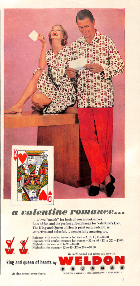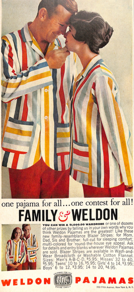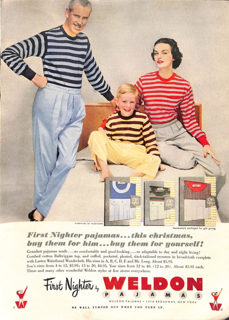 Weldon was a company that made pajamas for adults and children. They often advertised in mid-century magazines like the ad you see below from the February edition of Cosmopolitan.