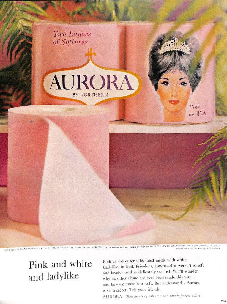 If you thought toilet paper was white, you would be wrong. Northern offered their Aurora double ply toilet paper two-tone in the 1960s. The top ply was pink and the bottom was white. Northern also sold their Aurora brand in yellow, lavender and just plain white. This was according to the above ad from the December 1964 edition of the Ladies Home Journal.