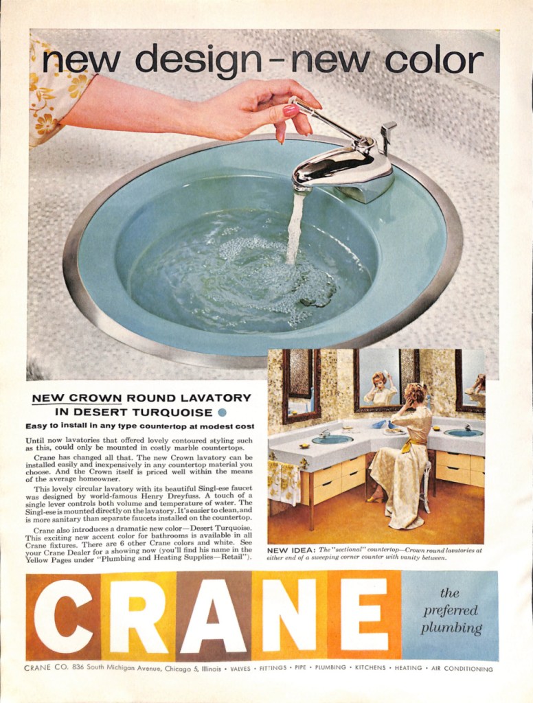 Speaking of colorful teal bathrooms, take a look at this ad. It is from American Standard plumbing and appeared in the September 1958 edition of Better Homes & Gardens. That’s a lot of color, but I do love the vase-themed wall paper. Note the design of the toilet. It is made to attach to the wall.