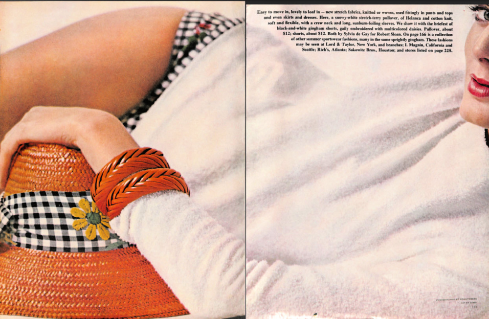 “Easy to move in, lovely to loaf in – new stretch fabrics, knitted or woven, used fittingly in pants and tops and even skirts and dresses. Here, a snowy white stretch terry pullover of Helanca and cotton knit, soft and flexible with a crew neck and long, sunburn foiling sleeves. We show it with the briefest of shorts, about $12. Both by Sylvia de Gay for Robert Sloan.”
