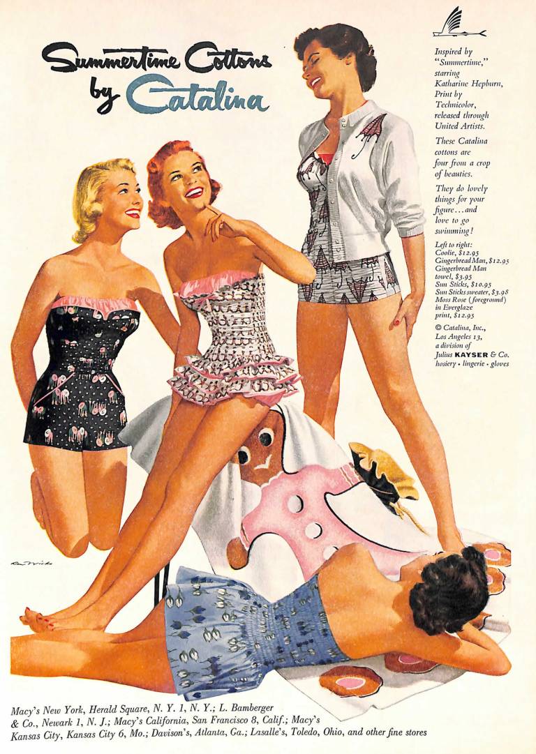 Swimsuits from the 1950s show us why mid-century looks are iconic. Catalina is a swimwear brand that did a great job with advertising in women’s magazines. The looks you see here are from 1956.
