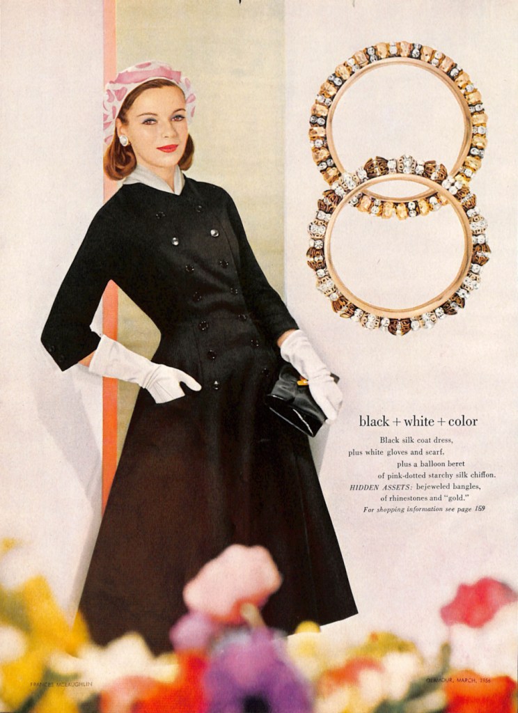 The model you see below comes from the mid-1950s. Fashion editors at Glamour magazine put this look together in an article titled, “Black + White + Color”.