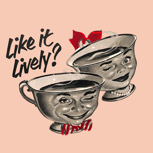 Our final favorite mid-century coffee ad is this pair of smiling coffee cups. They are actually not advertising coffee, but tea. The image was part of a Tender Leaf tea ad from 1952. This one is especially delightful to me because I have the smiling female tea cup in my cupboard. I found it in an antique store several years ago.