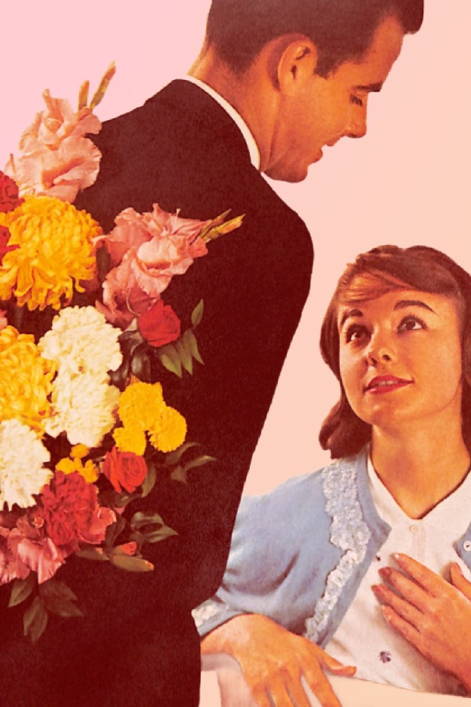 Tell her you love her with a bouquet of flowers. This picture shows a man holding flowers behind his back. It comes from a 1960 ad for the Society of American Florists.