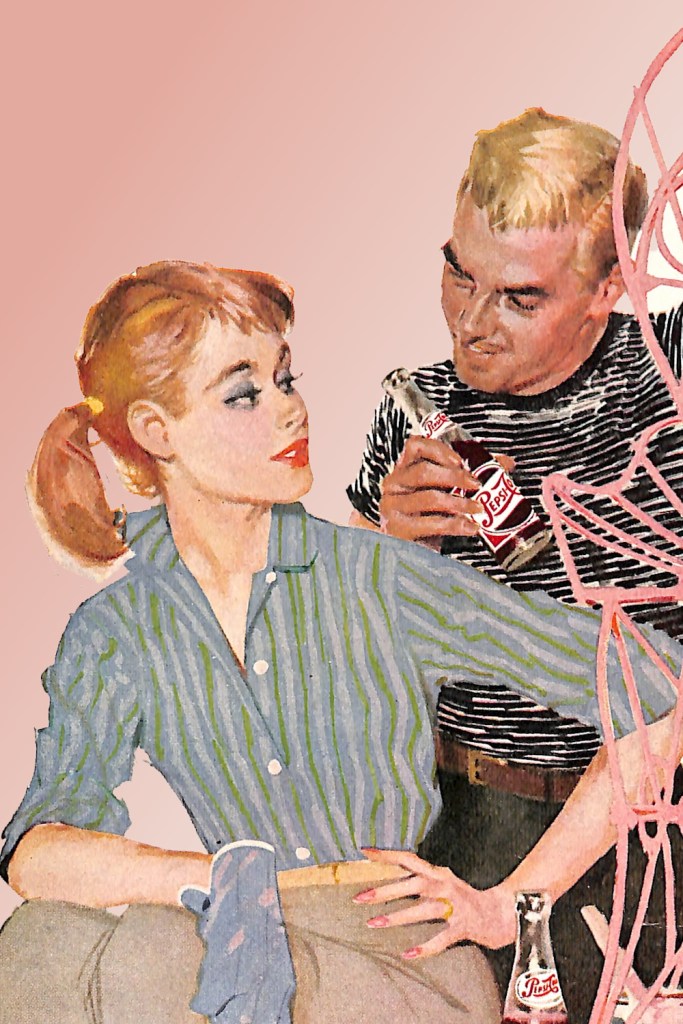 My final favorite mid-century couple graphic comes from a 1957 Pepsi ad showing a 1950s woman taking a break from painting a chair. Her man has just handed her a Pepsi in the classic bottle. The illustration is 100% Americana.
