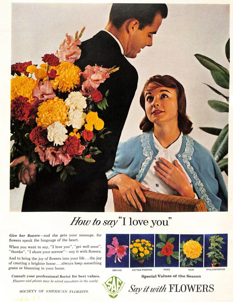 Romance has not changed through the decades. How do you tell someone you love them? Say it with flowers. The ad you see comes from 1960. The full page ad was published in the December issue of McCalls magazine by the Society of American Florists.