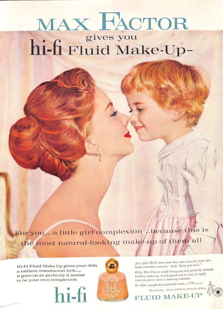 The above ad for Max Factor was found on the pages of the March 1959 edition of McCalls magazine. It features an adorable nose-kiss between mother and daughter. The ad is for the brand’s line of hi-fi fluid makeup.