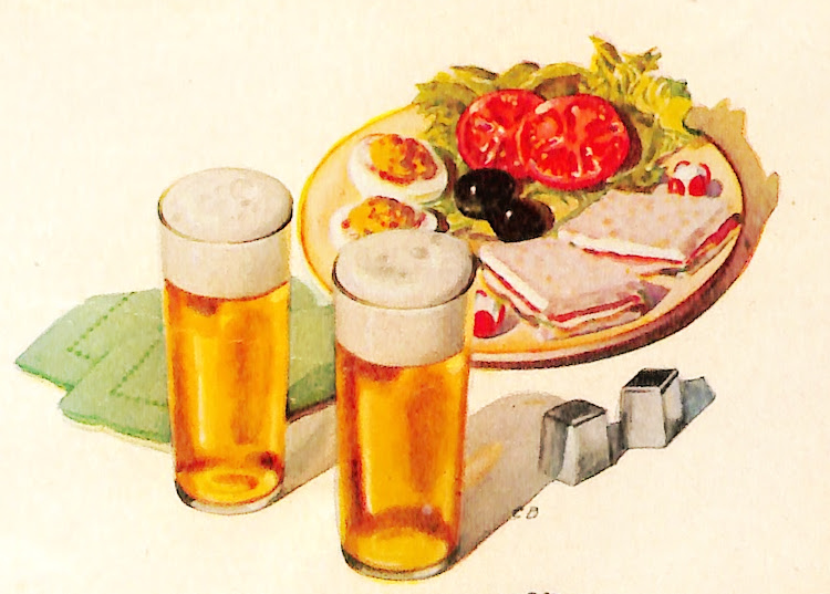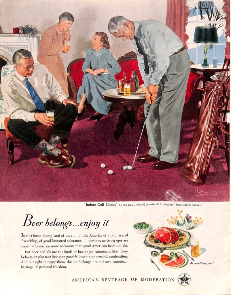 In the early part of the mid-century, it was common for companies to hire popular illustrators for ad campaigns. One such illustrator was Douglass Crockwell who painted a series of illustrations for The United States Brewers Foundation.